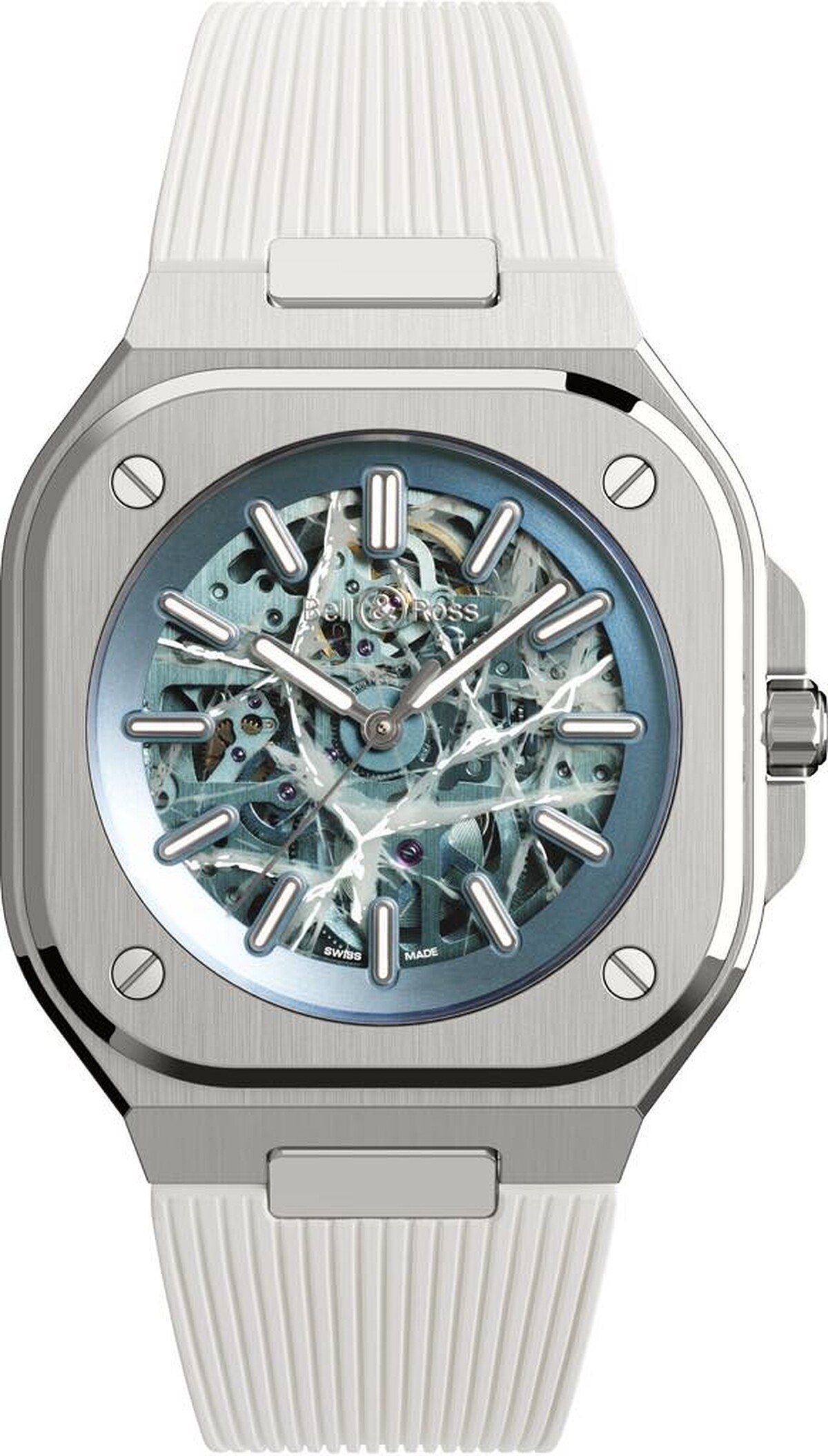 BR-05 Skeleton Arctic Blue 腕錶,錶盤由藍色玻璃和金屬藍色斜面邊緣組成,並有由雕刻和移印的冰晶效果裝飾,Bell & Ross。