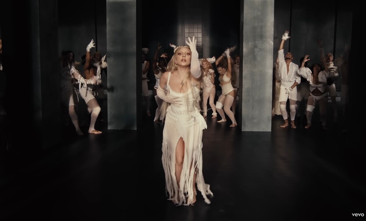 開啟舞蹈的第一套白色緊身衣造型,為Olivier Theyskens 1999年春季系列作品的延伸,由金屬鉤扣描繪出十字架形狀,搭配公主的髮型,使浪漫仙氣的形象裡隱藏一股狂氣。外層的巴洛克風格大裙襬,則是由設計師Samuel Lewis、Suman Gurung、Ilona共同以Givenchy 1998年秋冬閉幕秀款為基底,用舊婚紗升級重新打造而成,伊莉莎白衣領與巨大的衣襬皆美得令人屏息,且這是Alexander McQueen執掌時期的作品,Lady Gaga在過往許多重要時刻都曾穿著McQueen的設計,是一項勾起粉絲們回憶的時尚聯動。