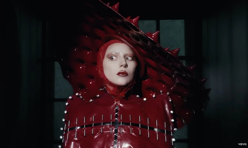 MV最一開頭,Lady Gaga以血紅色的尖刺造型扮演女王的角色,俯瞰著底下的舞蹈戰爭,這套乳膠材質的服裝由紐約藝術家 Renee Masomian設計,使用金屬零件拼接面料,營造出怪異的縫補效果,戲劇性的尖刺大帽子,則是由柏林帽飾設計師Maximilian Gedra所打造,讓角色居高臨下的模樣更為具象。