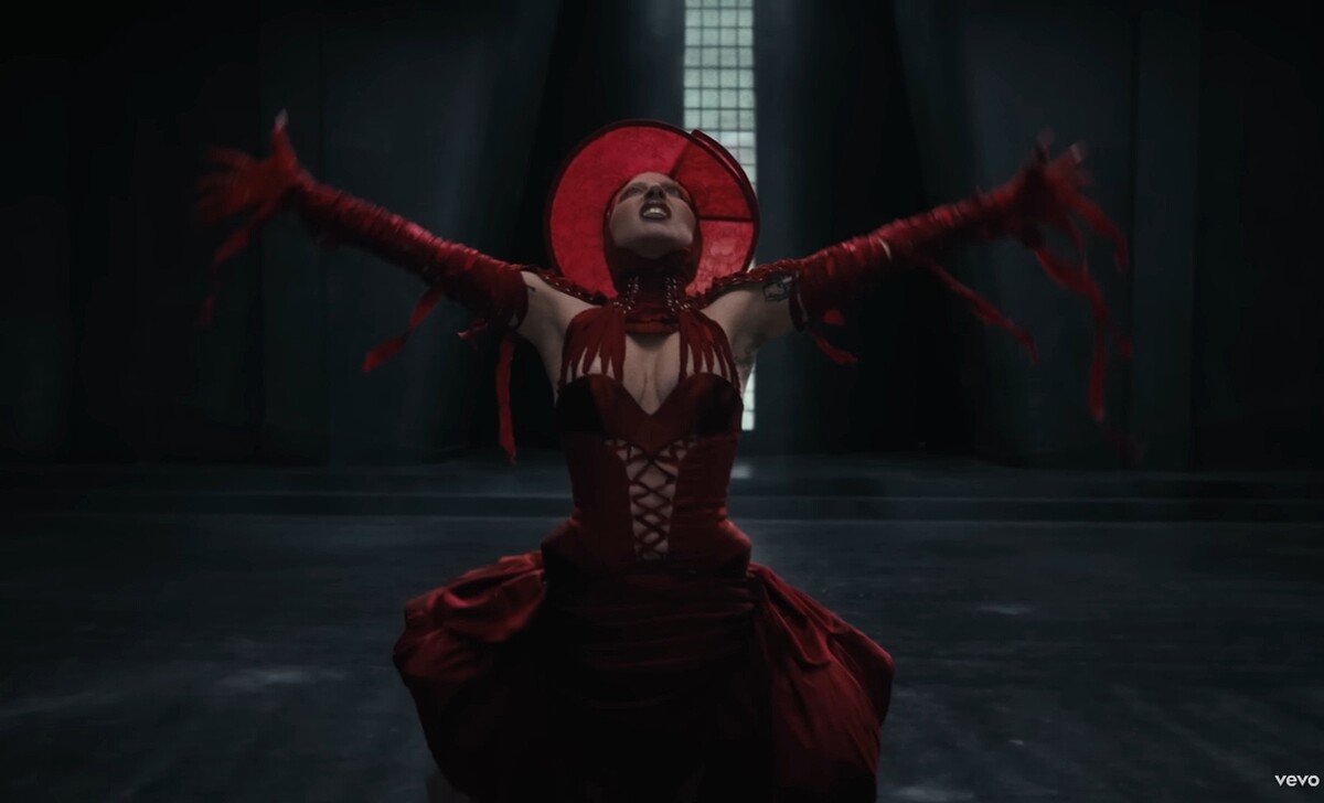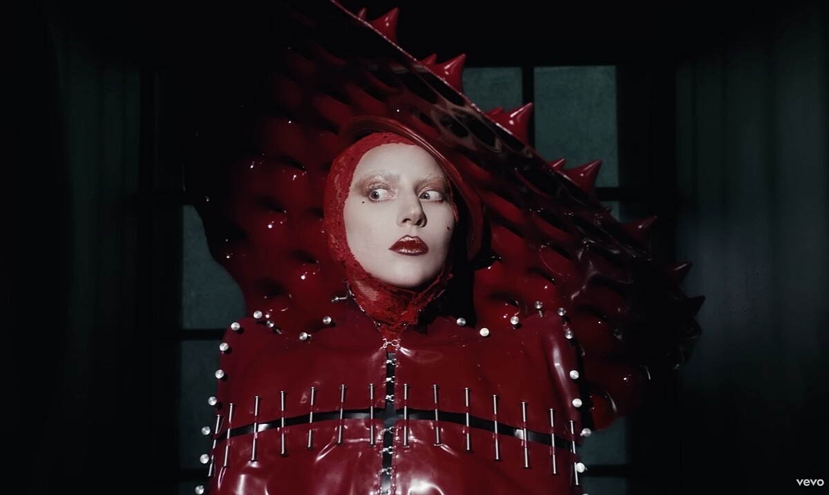 MV最一開頭,Lady Gaga以血紅色的尖刺造型扮演女王的角色,俯瞰著底下的舞蹈戰爭,這套乳膠材質的服裝由紐約藝術家 Renee Masomian設計,使用金屬零件拼接面料,營造出怪異的縫補效果,戲劇性的尖刺大帽子,則是由柏林帽飾設計師Maximilian Gedra所打造,讓角色居高臨下的模樣更為具象。