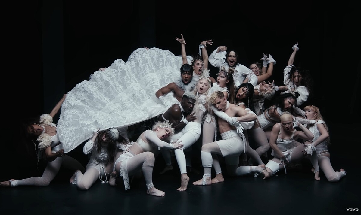 開啟舞蹈的第一套白色緊身衣造型,為Olivier Theyskens 1999年春季系列作品的延伸,由金屬鉤扣描繪出十字架形狀,搭配公主的髮型,使浪漫仙氣的形象裡隱藏一股狂氣。外層的巴洛克風格大裙襬,則是由設計師Samuel Lewis、Suman Gurung、Ilona共同以Givenchy 1998年秋冬閉幕秀款為基底,用舊婚紗升級重新打造而成,伊莉莎白衣領與巨大的衣襬皆美得令人屏息,且這是Alexander McQueen執掌時期的作品,Lady Gaga在過往許多重要時刻都曾穿著McQueen的設計,是一項勾起粉絲們回憶的時尚聯動。