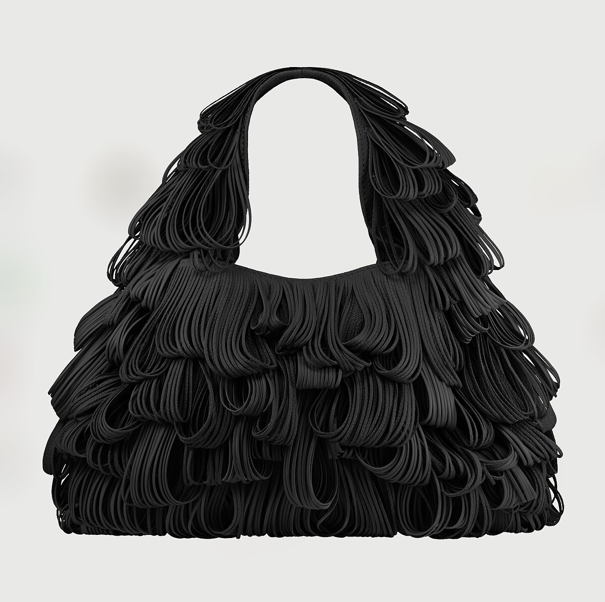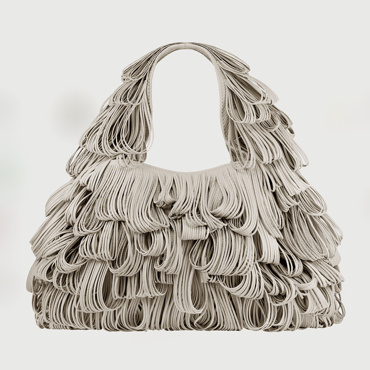 在Ubrique的皮革工坊中,工匠將皮革餘料預裁成條狀,並利用模切工具製成流蘇。 三種不同長度的流蘇分別回折,形成漸變層次的效果。可肩背、手提或置於臂彎,背攜時輕盈靈動,流蘇如纖細的柳葉隨風搖曳,優雅又可愛。