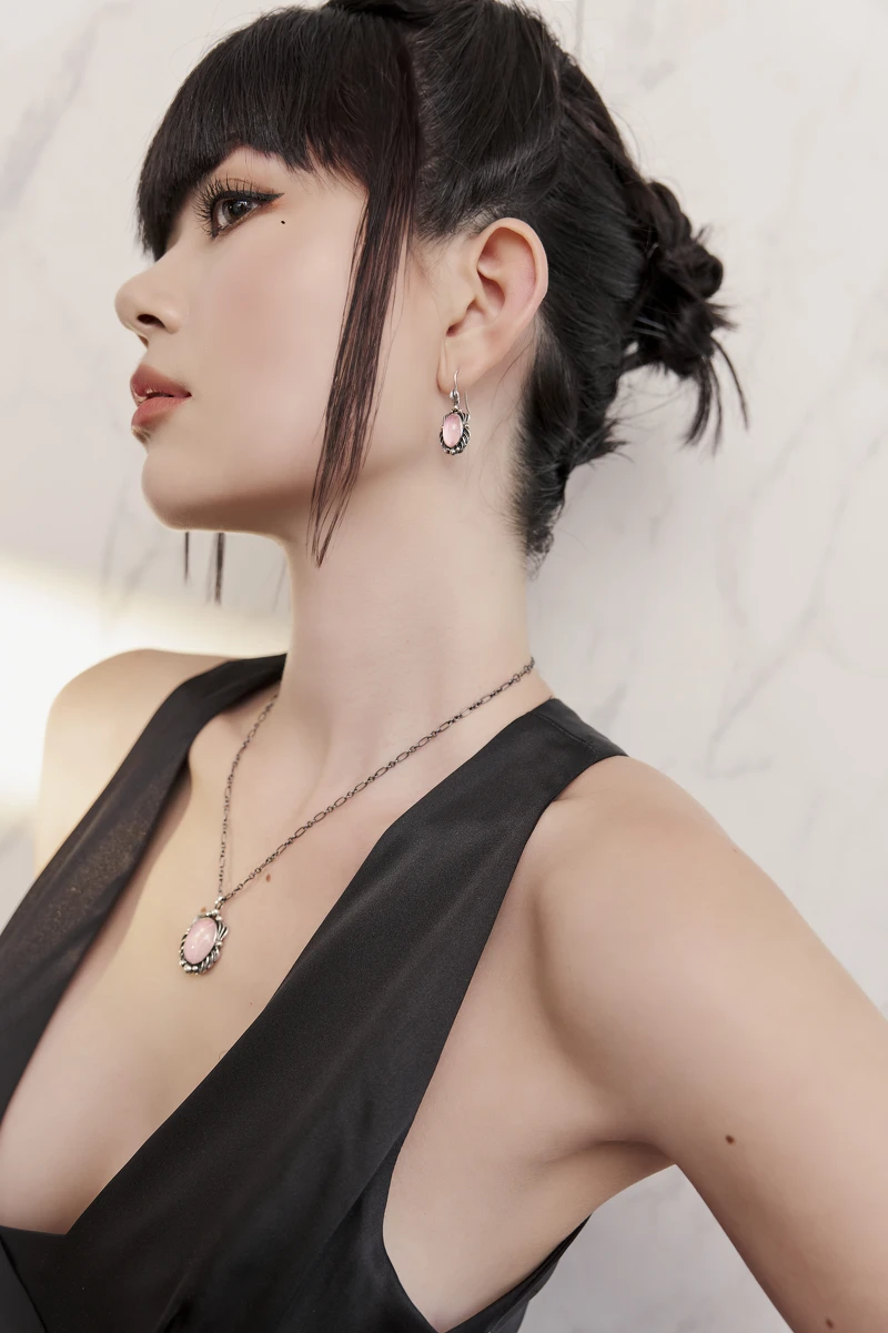 台灣獨家限定的粉水晶款式珠寶,中央處主石改鑲飾橢圓形蛋面切割的粉水晶,寶石環側綴以小巧銀珠,以華麗設計再現細膩匠心,經由Kimberlly Chen的配戴更可細窺粉水晶珠寶的細膩精緻,很適合偏愛運用粉嫩柔美色調的女性,以此串起溫柔情感,譜寫專屬自己的幸福光景。
