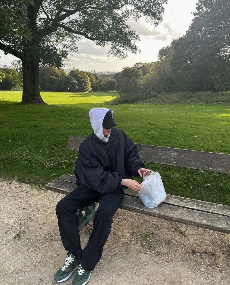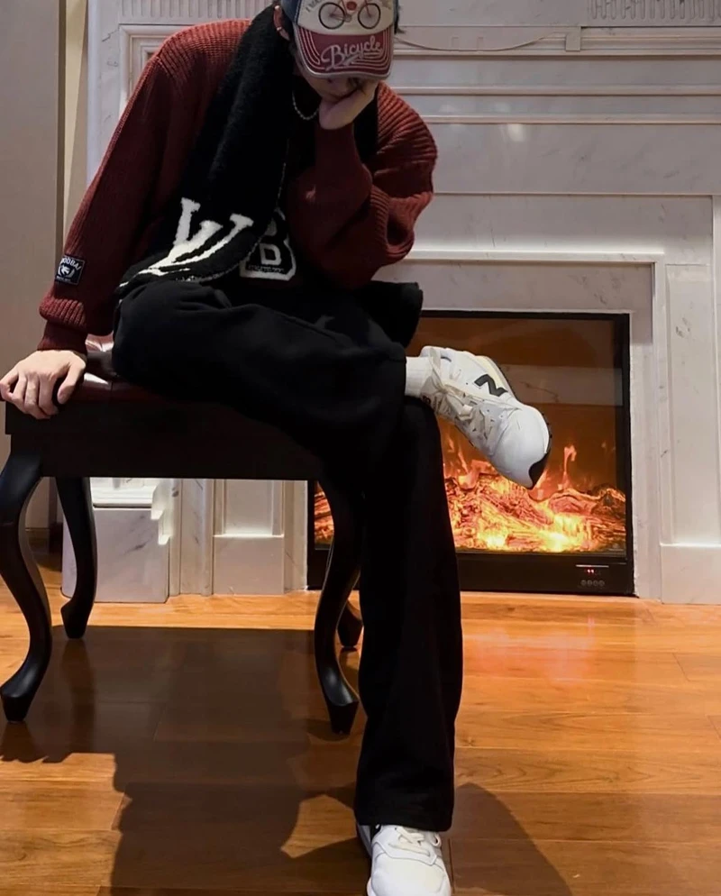 白敬亭於2021年創立個人品牌「Goodbai」,能夠時常在他的私服裡看到Goodbai的身影,這套造型展現輕鬆的街頭風格,灰色Goodbai連帽衛衣上的彩色字母點綴,很有活潑氣息,同時又保持低調的時尚態度。黑色寬褲流暢的輪廓,把他落落的大長腿展露無遺,搭配棒球帽與皮靴,更進一步強化休閒街頭風格的完整度。