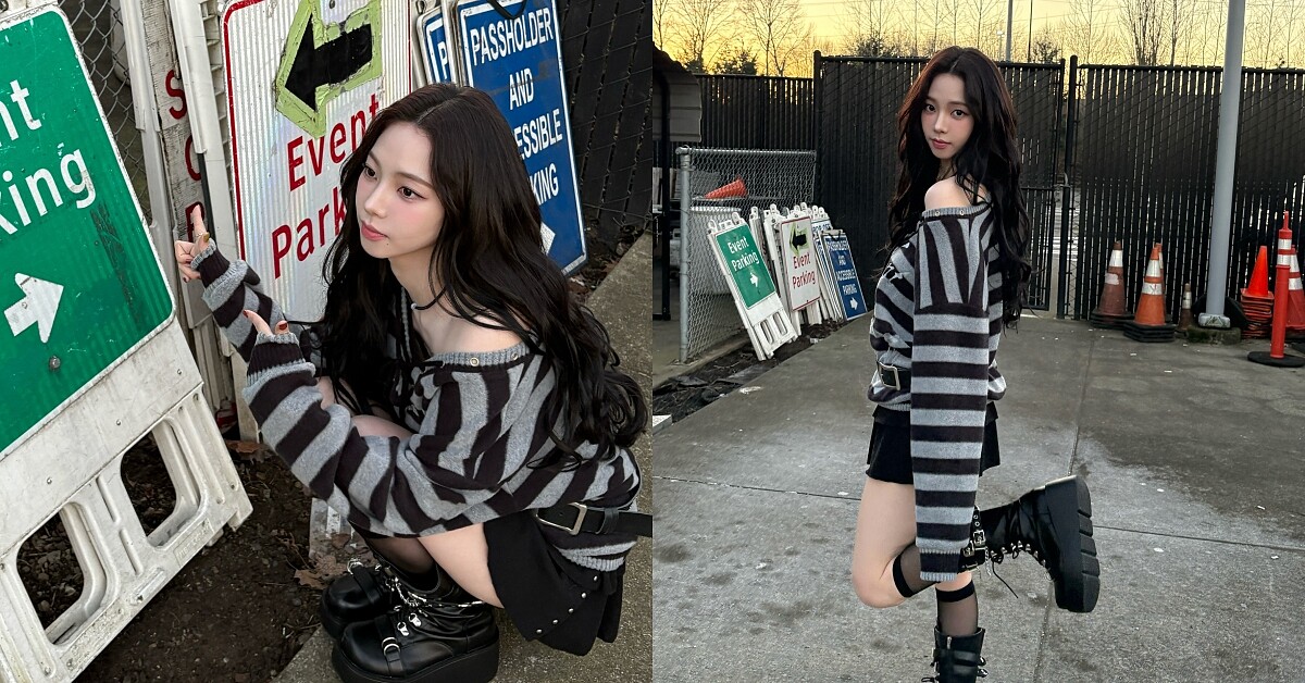 甜酷女孩必備基礎款的「黑灰相間」款式,Karina的私服總是能在基礎款的單品中找出變化感,微微露出肩膀的設計營造性感的小心機,配上同色系的短褲不搶走上衣的風采,想要看起來腿更修長、纖細,一雙厚底綁帶靴是必備,整體看起來色系和諧又不失時尚感。