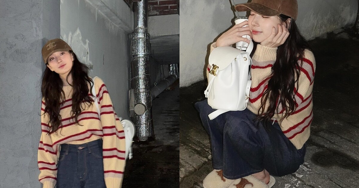 秀智的私服穿搭重點在於「打造鬆弛感」,蓬鬆的捲髮、休閒的棒球帽和基本款的牛仔褲都是普通女生可以參考的入門公式,而身為「國民初戀」的秀智,他的穿搭也多以米白色等溫柔色系的款式居多,間隔較寬鬆的條紋視覺上看起來更舒展、放鬆,也能夠給人第一眼就帶來好印象。