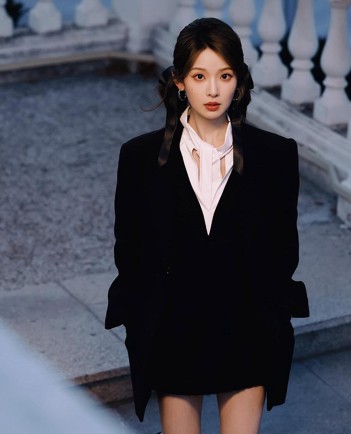 張淼怡這套寬肩西裝燥簡直霸氣外漏!內搭領結襯衫散發優雅氣韻,下身則露出纖細雙腿,打造上寬下窄的時髦比例。