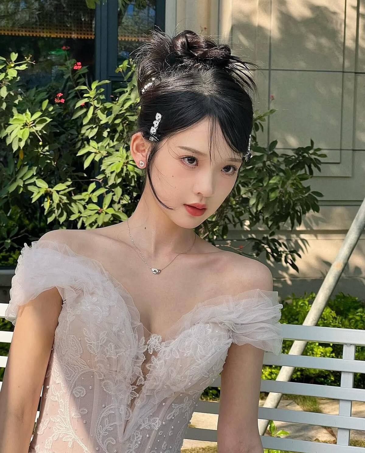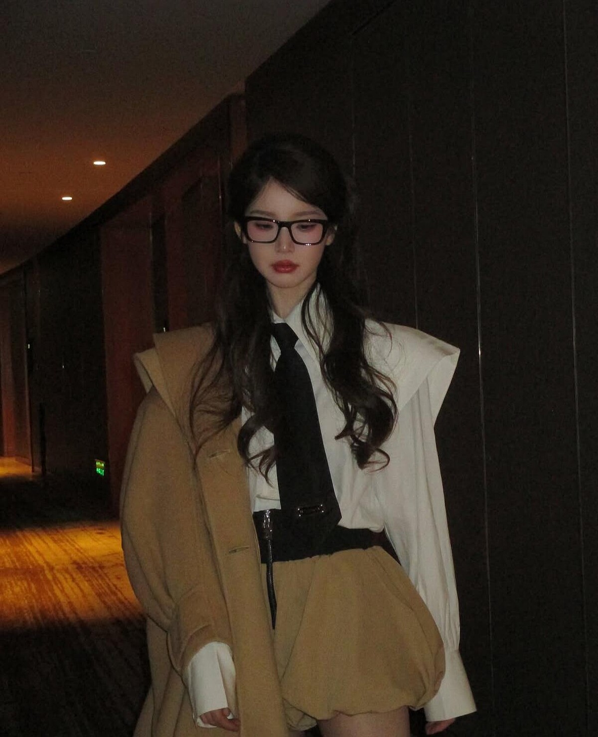 擁有一張幼態臉的張淼怡,相當適合學院風格的造型。這套造型裡張淼怡戴上黑框眼鏡、打上領帶營造書生氣息,不過她可是個千金書生!加寬的領片超出肩線,泡泡裙增加俏皮感,最華麗的女學生非她莫屬。
