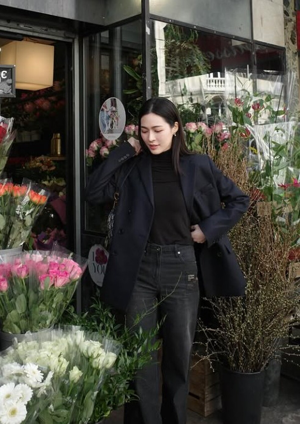 為了增強丹寧外套搭配丹寧牛仔褲在造型上的層次表現,鄺玲玲以黑色內搭高領作為這身別緻造型的打底衫(這個小細節巧妙地拉長了整體視覺比例),搭配高腰牛仔褲,突顯腰部的玲瓏線條。整體造型充滿都會時髦與優雅韻味,再次展現鄺玲玲的時尚好品味。