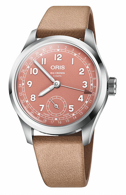 新錶延續其簡潔經典的設計,視覺上以令人愉悅的色彩,讓錶迷們用不同的賞析視角來感受其魅力:Oris Big Crown 指針式日曆腕錶通用機芯款,推出34、40mm 兩種錶殼尺寸,前者有米棕色及黑色搭配鑲嵌實驗室培育鑽石刻度,兩種面盤美學呈現,後者能選擇湛空藍、靛暮紫、 燦陽黃三種色彩變化,精鋼鍊帶皆搭備品牌研發的折疊扣。Oris Big Crown 指針式日曆腕錶自製 Cal. 403 機芯款,提供十年保固、高抗磁和五日儲能,暖杏紅或輕霧綠色錶盤於6點鐘方向配置小秒盤,精鋼鍊帶或 Cervo Volante 鹿皮錶帶皆配有摺疊扣。