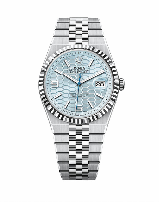 2025年的勞力士特別多彩繽紛。經典款 Oyster Perpetual 推出開心果綠、薰衣草紫等面盤新色,Daytona 以18K黃金錶殼與綠松石面盤的組合亮相,首次現身的還有載於1908系列的七格鏈帶。重中之重當數全新型號 Land-Dweller,正式發表前由代言人費爸費德勒在社群上悄悄曝光,絲毫不減話題性。品牌歷經七年的研發新作,幾何輪廓的錶殼與專屬纖薄紀念型(Flat Jubilee)錶帶的驚喜搭配,營造出70年代復古又流線現代的興味;錶帶中央、坑紋錶圈的拋光效果,引領視覺聚焦面盤特色的雕刻蜂巢圖騰。內在全新自動上鍊薄型機芯7135,以振頻高達5赫茲精確至1/10秒的計時力,為品牌功能性帶來新篇章。