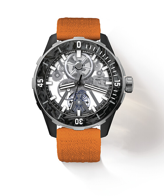 雅典錶把日內瓦錶展空間打造成科學實驗室,並以一個獨家方程式,解開了打造「史上最輕盈機械潛水錶」的研發難題:Diver [AIR]腕錶搭載的UN-374機芯,經大幅鏤空設計簡化,內部有80%為空隙(空氣),僅20%為元件,擒縱機構採用回收再造的矽,錶殼中層橋板和主夾板的也利用高達90%的再生鈦金屬,可承受5000G的衝擊力以及200米的防水深度。錶殼側面、單向旋轉內凹錶圈也採用極輕的的尼龍纖維和碳纖維再生物料,包括錶帶和錶身總重只有52克。從材質與結構的輕量化和永續性,重新定義專業運動腕錶的先鋒樣貌。