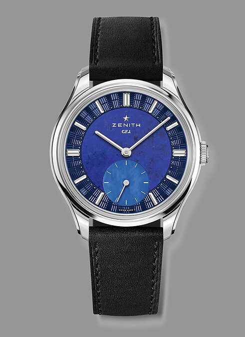 Zenith 於多款新錶上揮灑藍色,像在呼應「天空至高頂點」的品牌名稱含義,同時是創立160年週年的最好慶祝方式。當中一款以品牌創始人 Georges Favre-Jacot 的姓名字首為名,特別限量生產160只的G.F.J.腕錶格外吸引人注意。鉑金錶殼、青金石錶盤和藍色珍珠母貝小秒盤,外圈再飾以獨特「磚形」雕花的搭配,盡顯內斂雅紳氣質。搭載新一代版本135型手動上鍊機芯的選擇,背後也別有故事性——源自品牌歷史上具重要性的一枚,它以能帶來更強慣性的特大擺輪和新穎結構,為 Zenith 拿下多次沙泰爾天文台競賽冠軍,奠基其卓越名聲。新機芯的打磨修飾,精準穩定和整體性能皆更為優化。