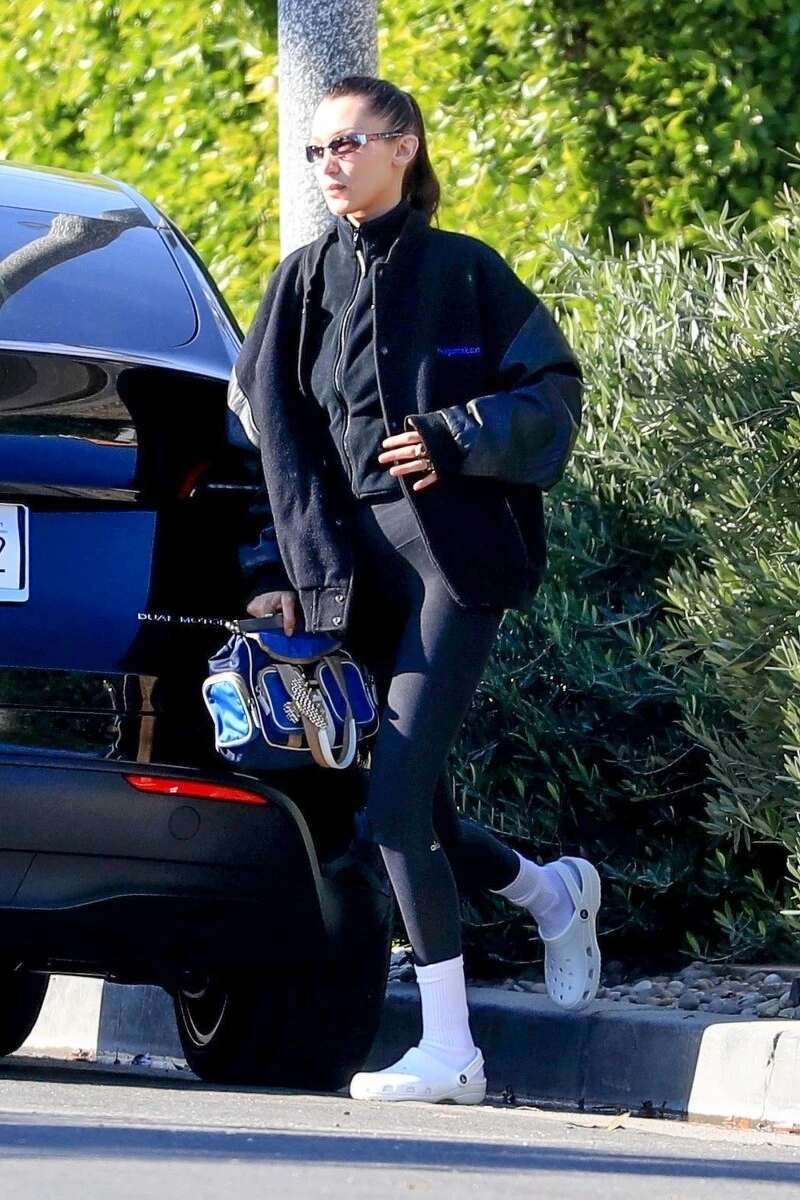 Bella Hadid 以白色 Crocs 搭配運動造型,墨鏡的細節與全黑的風格對比上白色鞋款,營造一種時髦又有態度的街頭混搭感。