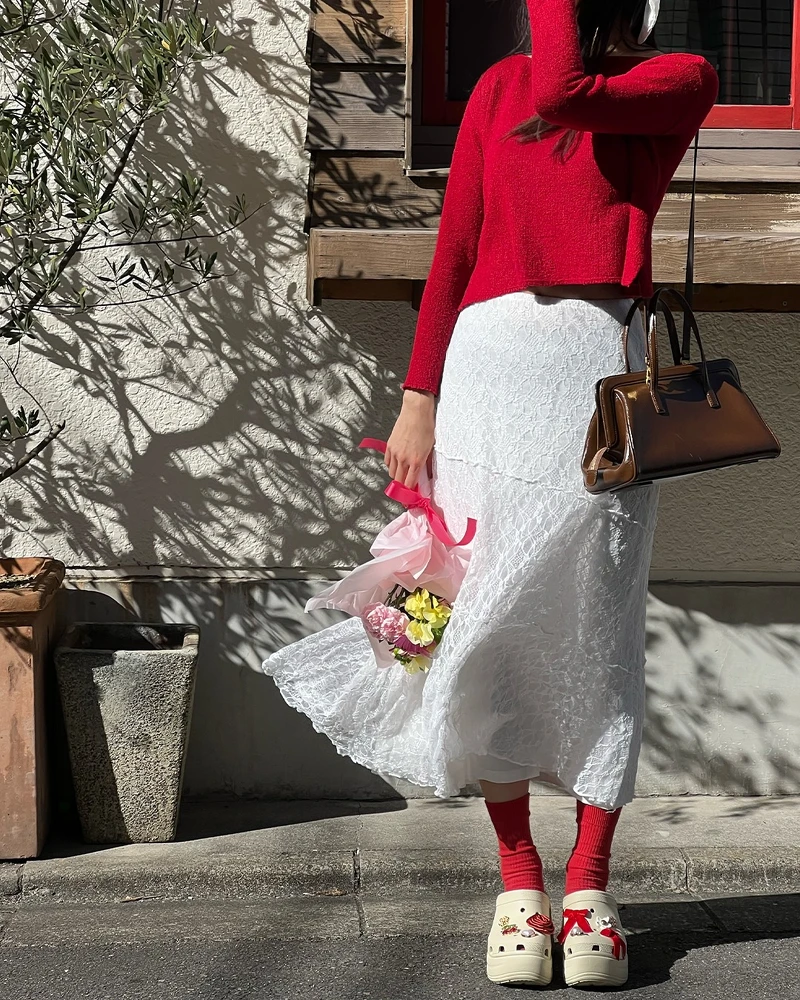 想打造韓劇女主角般的學院感穿搭?選擇一條百褶裙搭配針織背心,加上一雙粉嫩色系的 Crocs,再配上長襪點綴,就能營造出甜美又青春的氛圍。這樣的組合非常適合大學生或年輕女孩,簡單卻充滿細節,尤其搭配襪子穿 Crocs,更是韓妞間默默流行的可愛穿法。