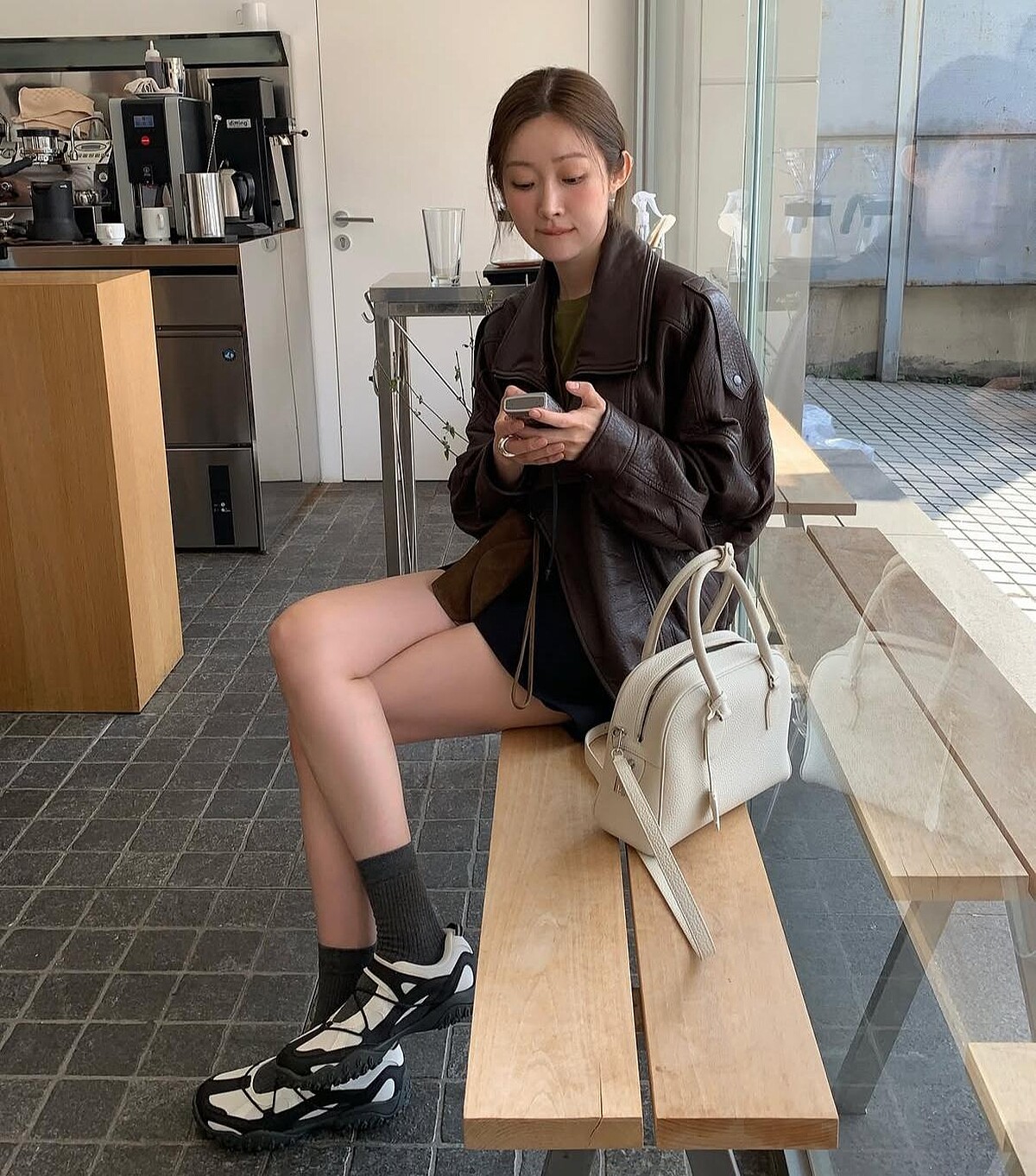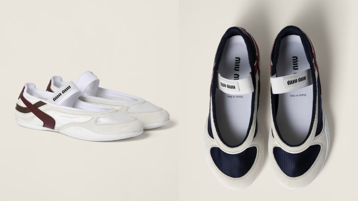 機能性面料與麂皮的組合洋溢復古韻味,上方加入Miu Miu熱賣芭蕾舞鞋的相同織帶設計,將這雙運動風休閒鞋轉化為瑪莉珍的樣貌。