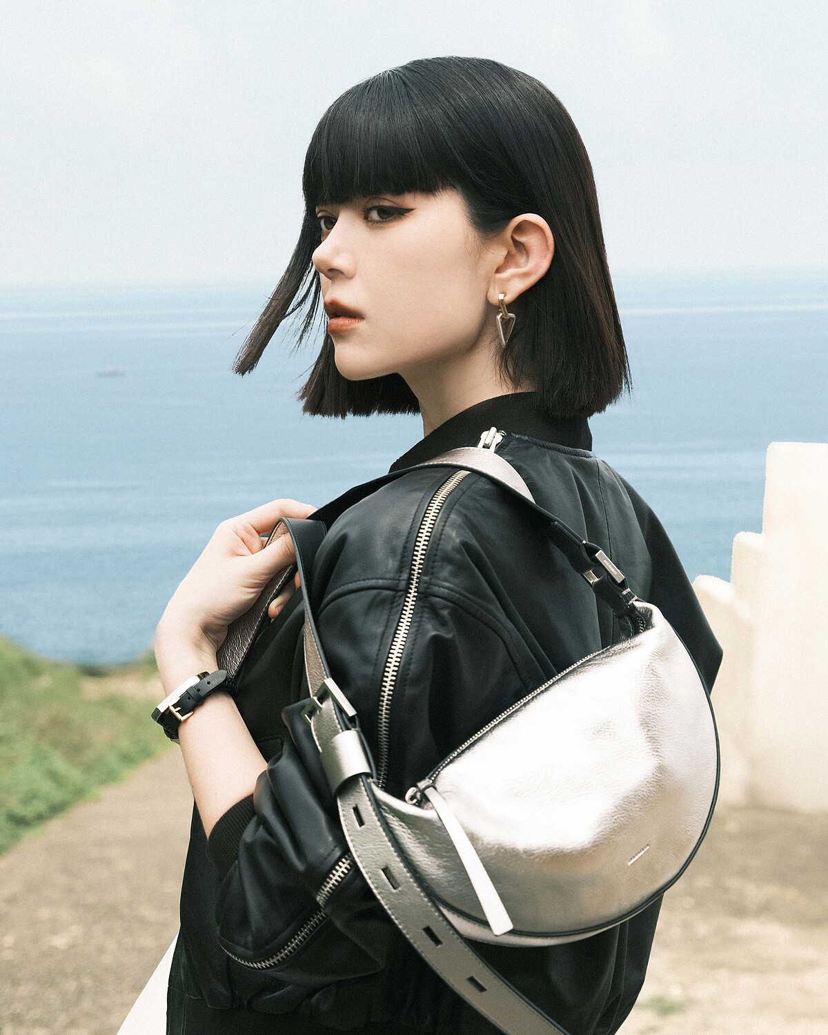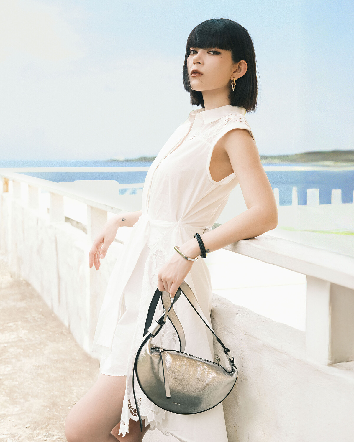 俐落剪裁的清爽白色洋裝,可在設計細節中窺見強大的設計巧思,不規則剪裁讓白系MONOTONE 營造出更顯層次感的蕾絲布料裁片,是最讓Kimberlly讚賞的亮點,大膽配上衝突的硬派皮革外套與銀色半月包款,不僅呼應度假主題中海面波光粼粼的視覺,也讓現代女子不單一多面向的特質,透過盛夏時節優游於城市與海岸交界的雙重魅力一一展現。