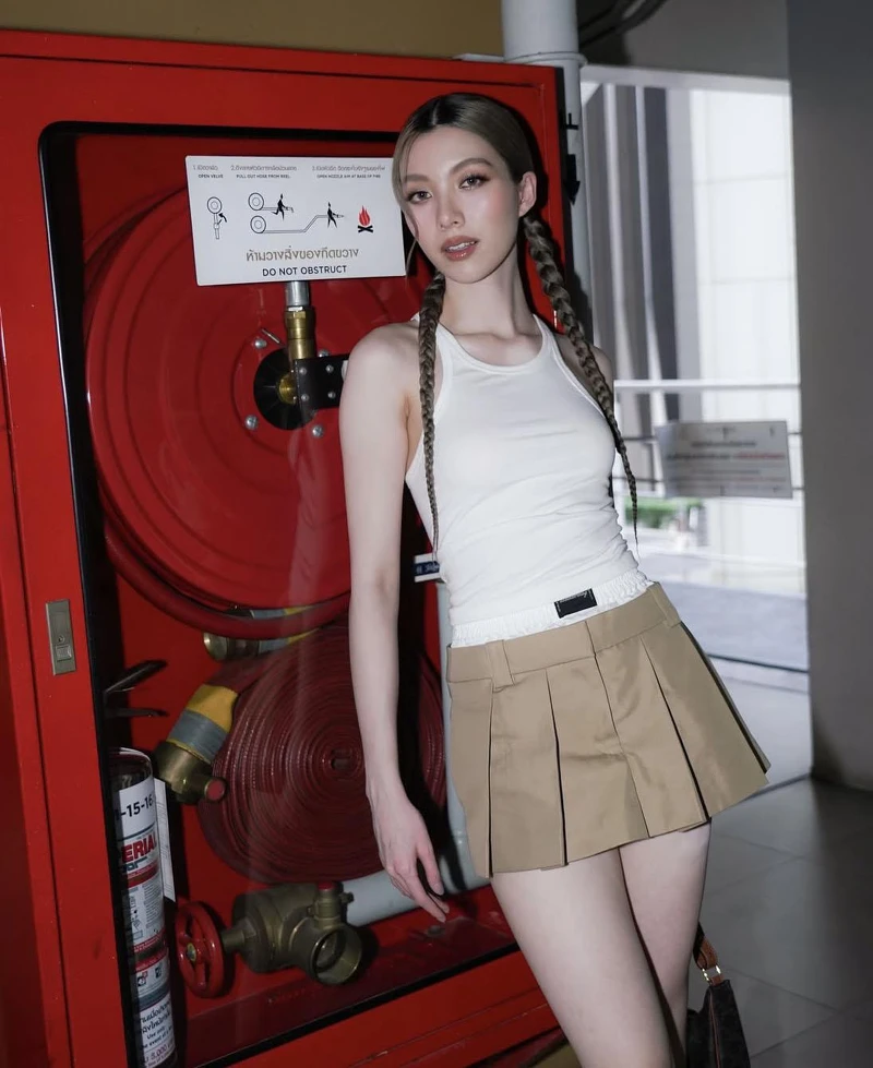 Kornnaphat穿上Dior白色細羅紋背心,搭配精緻的卡其色百摺裙與雙辮的造型,完全就是個俏麗的高中女學生,這個不靠華麗配件的造型依然時髦得讓人難忘。關鍵是選對材質與剪裁——夠挺以及貼身的立體感,就能展現俐落兼具優雅的氣質。