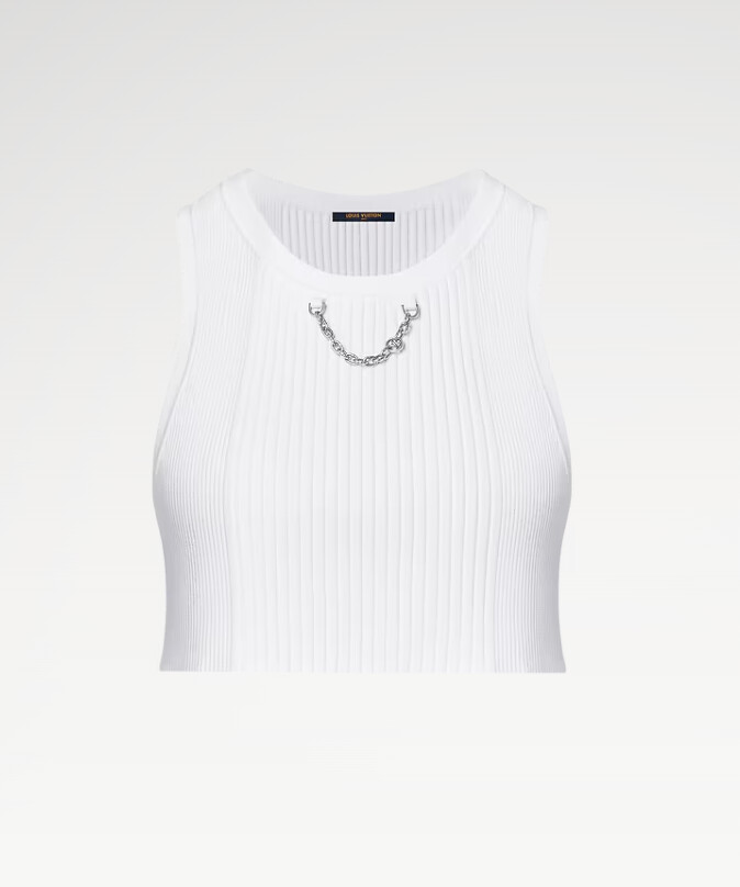 這款短身上衣以彈性Viscose面料裁製,修身版型別具靈活彈性,散發時尚的運動氣息。上衣以粗幼混合羅紋設計,造型更見昇華,而圓領則以LV Circle鏈帶細節裝飾,增添現代風格的標誌,推薦給時髦的你。
