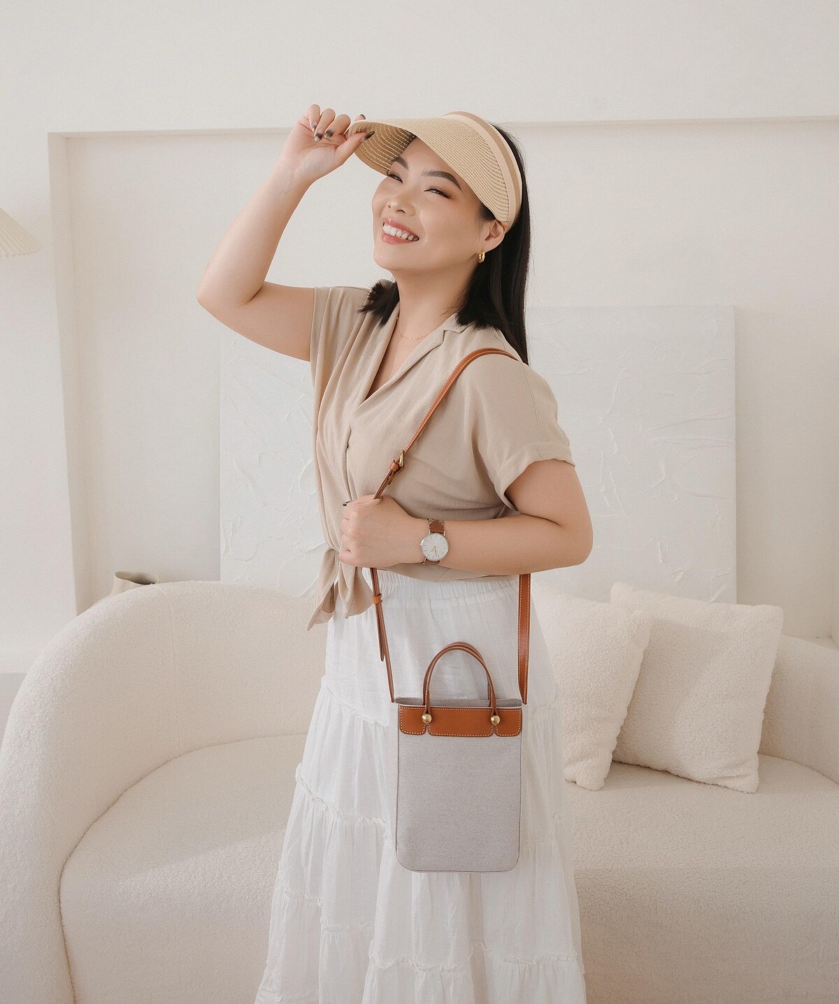 而Yoyo則是選擇較有溫柔氣質感的上衣及長裙組合,並搭配上植鞣皮革與帆布拼接打造的ZODENCE DION小方包,無論手提、肩背或斜背都很方便,簡單穿個連身裙背上這款包包就很有春夏最夯的微度假感,簡單大方且精緻耐用的美 包就是替穿搭品味加分,不管是平常休閒背還是上班背都很適合!