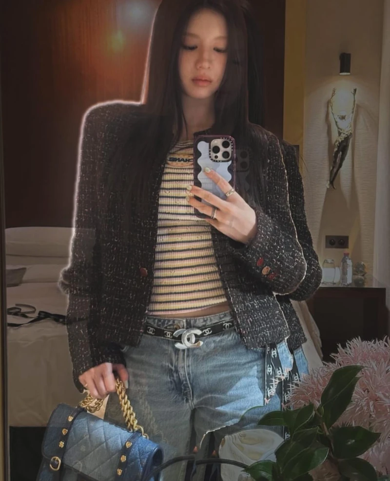 高允貞完美演繹了如何將優雅Chanel搭的個性帥氣,當她穿著率性的牛仔褲裝造型時,選擇用一款漸層刷色的丹寧材質手袋來搭配,襯托中性的自在風格,此款手袋上丹寧與金屬的配色亮眼,還有俏皮的金屬釘裝飾,悄悄藏了點少女心。