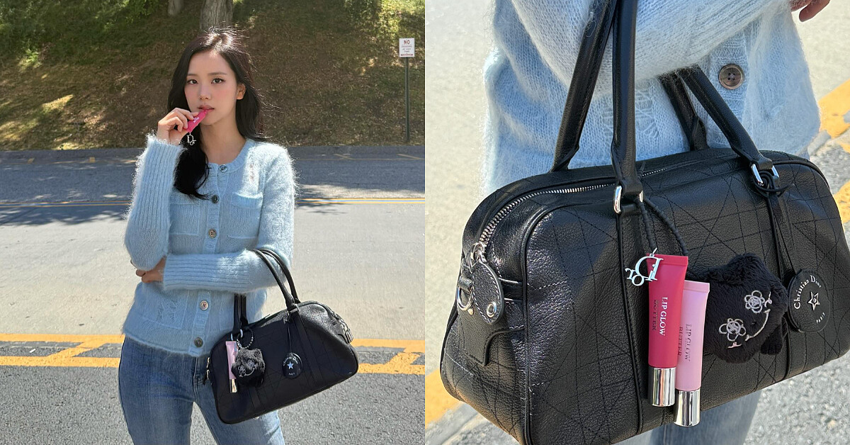 在美妝圈跟上了千禧熱潮「軟管唇蜜」閃亮回歸成為配件,Jisoo便以個人快閃店周邊的「灰塵寶寶」搭配,將實用又可愛集合在包包上,既低調又有小亮點。