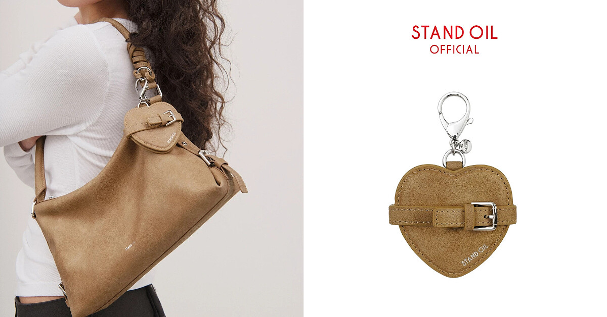 精緻女孩時刻都要保持漂亮!除了娃娃之外,鏡子也是很不錯的選擇。來自韓國人氣包包品牌STAND OIL的Belted Mirror Keyring,沉穩的焦糖色搭配粉色系穿搭,充滿時下穿搭趨勢「鹽系可麗露」的氛圍,掛在包包上隨時拿出來打理妝容非常方便。
