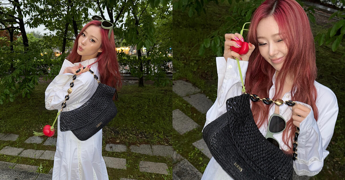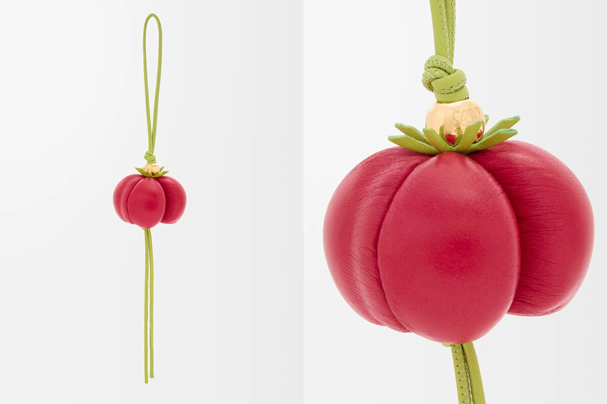 Giselle這組照片完美地展示了夏日女友風穿搭,編織包包配上白襯衫裙清純又優雅,而身為LOEWE品牌大使的她當然不能錯過今年最夯的番茄系列,這款採用小牛皮製成的番茄掛飾精緻又可愛,上面配有Anagram設計,展現低調的奢華。