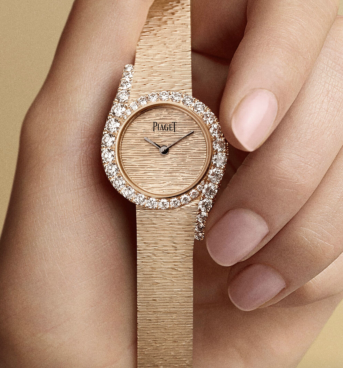 提及Piaget的「經典」,不能少了Limelight Gala腕錶,特別是以經典「Décor Palace宮廷式雕刻」工藝裝飾錶盤和錶鍊的款式。宮廷式雕刻工藝最初源自鐘錶工藝中的古老的璣鏤鐫刻(Guilloché)技術,以重複圖騰鐫刻錶盤,後來被Piaget運用於金質珠寶、腕錶中,每一道刻紋皆由工匠手工鐫刻,規律排列但富有變化的紋理,為腕錶帶來層次感。而Limelight Gala腕錶獨特的不對稱錶耳與流線型輪廓,搭配如同手鐲卻柔軟服貼的宮廷式雕刻錶帶,使它不僅是腕錶,更能當作珠寶首飾搭配,無論正式場合搭配正裝,又或是簡單的白T、牛仔褲,都能巧妙為穿搭增添亮點。
