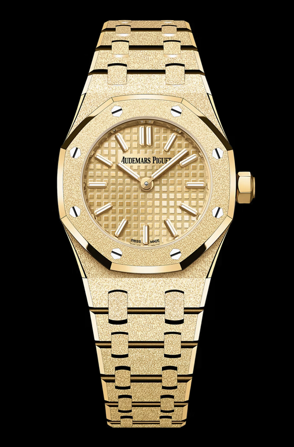 皇家橡樹系列迷你霜金石英腕錶,此款23毫米當代風格的腕錶受1997年的Royal Oak皇家橡樹系列迷你腕錶啟發,其18K黃金錶殼與錶鍊閃耀著霜金光芒,與同色系「Petite Tapisserie」小型格紋錶盤相得益彰。腕錶搭載石英機芯2730。參考價CHF 31,500