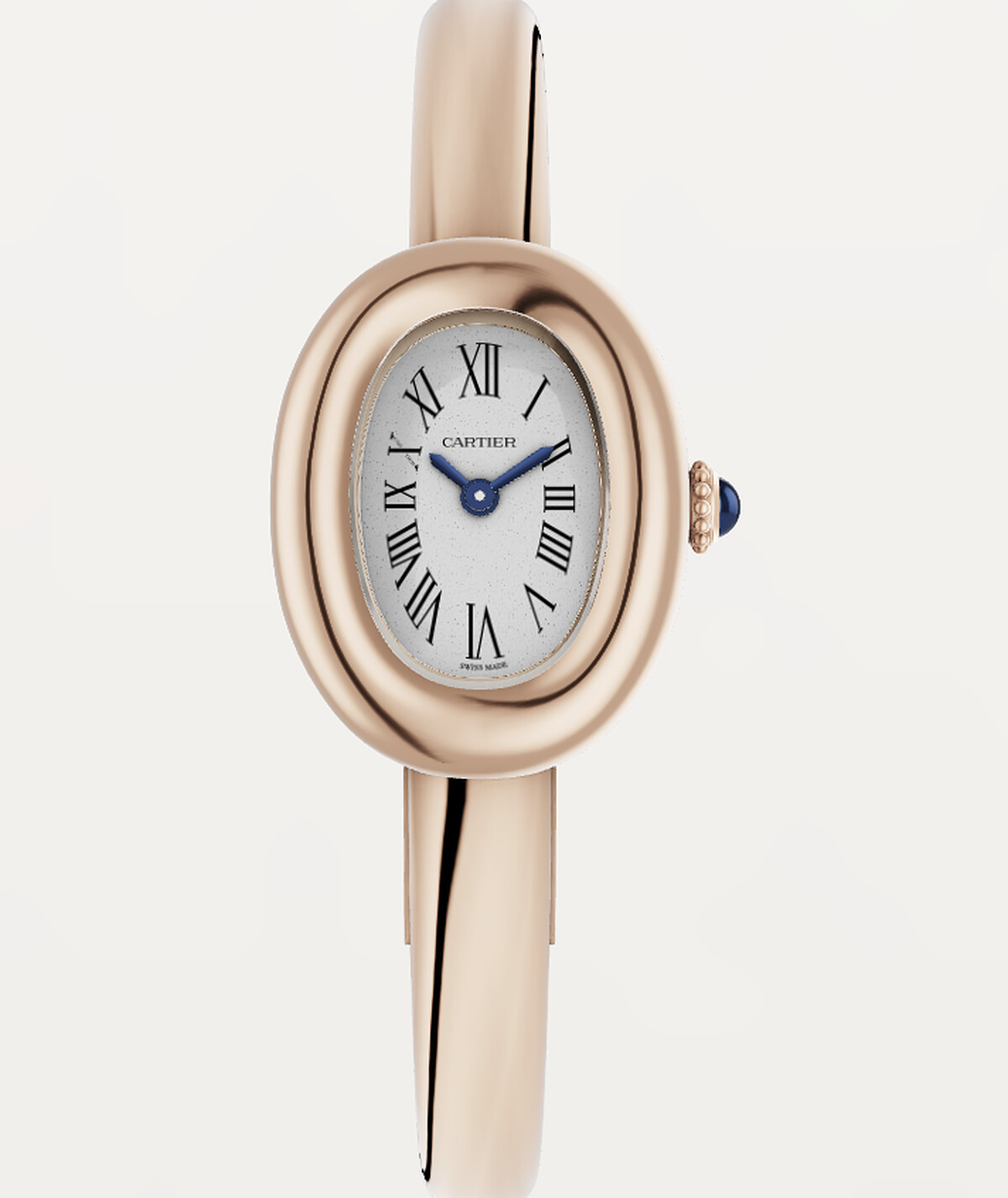 Baignoire de Cartier腕錶,迷你款,尺寸17,石英機芯。玫瑰金錶殼錶冠鑲嵌一顆凸圓形藍寶石。鍍銀錶盤,藍鋼劍形指針,藍寶石水晶鏡面。防水深度3巴(約30米)。參考價NT$494.000