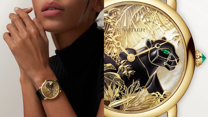 美洲豹的敏銳感知及矯捷身手,成就了牠在自然界中頂級掠食者的地位,其捕捉獵物時所需精確且克制的意志力,也反映在卡地亞的細膩工藝中。由品牌旗下大師工藝工作坊(Maison des Métiers d' Art)操刀的Ronde Louis Cartier Panthère大師工藝腕錶,就於錶徑36釐米的方寸間,活靈活現地定格了自然中轉瞬即逝的精彩畫面。以珍珠母貝雕琢而成的美洲豹,仿若從叢林的陰影處悄然現身,由黑漆和黃金細線點綴的體態輪廓,以及梨形祖母綠所刻劃的犀利眼神,共同塑造出栩栩如生的威猛神韻。用於隱匿其身軀的多層次黃金葉片,厚度僅75微米,需先以雷射精準切割成形,再小心固定於焊接在錶盤底座的細小金柱上。藉由金柱高低錯落的設計與手工摺疊的細節處理,使其呈現出層次分明的立體結構,並透過這項耗時3年研發的智慧結晶,層層堆疊出符碼背後聯繫傳統與現代的細膩靈性。
