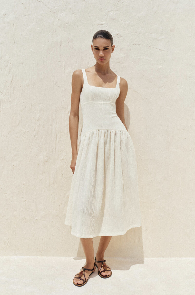 這件Zara中長版的白色紋理吊帶連身裙,有著方領以及寬肩帶的細節設計,讓你時髦有型。