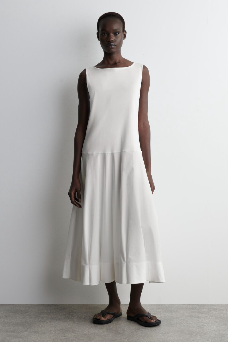 COS船領純棉A字中長洋裝,因為是純棉材質,所以走動時回會自然地飄逸,仿若時髦仙人,簡單又大方。