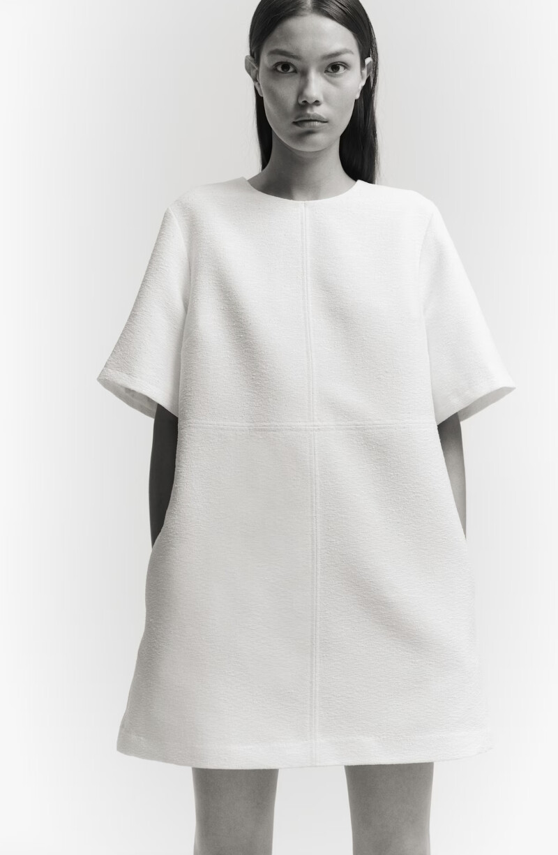 H&M白色圓領短洋裝,平織布料,有外露接縫設計,呈現精緻的細節。