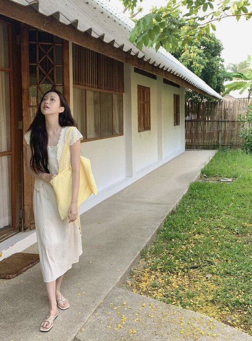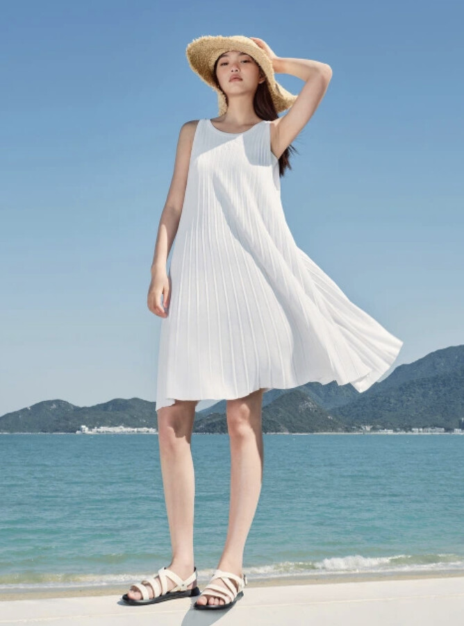 這款白色洋裝線條簡潔,沒有多餘的褶邊,而背處有細點設計,適合展現溫柔的氣質,推薦度假或是晚上約會時候穿搭。