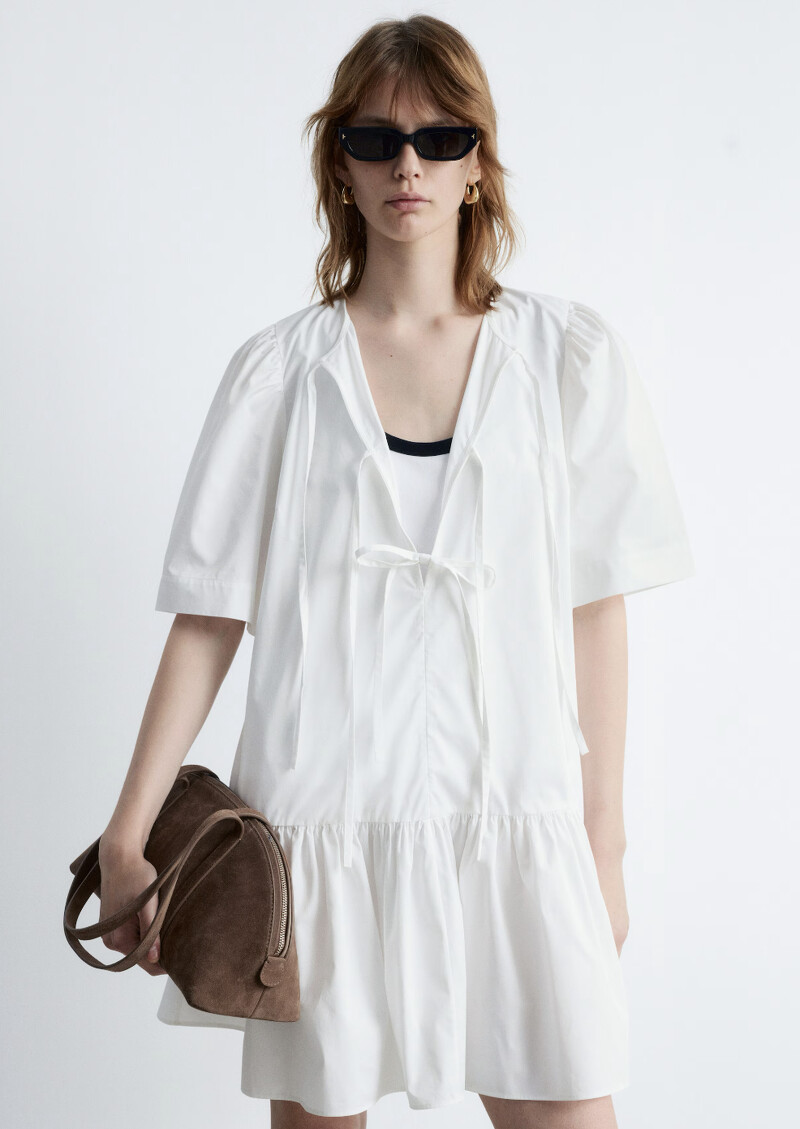 & other stories荷葉邊迷你洋裝,採用棉府綢製成,質感清爽輕盈。 而A字輪廓剪裁,短袖蓬鬆,荷葉邊下擺,增添靈動感、俏皮柔美,是不是浪漫有型。