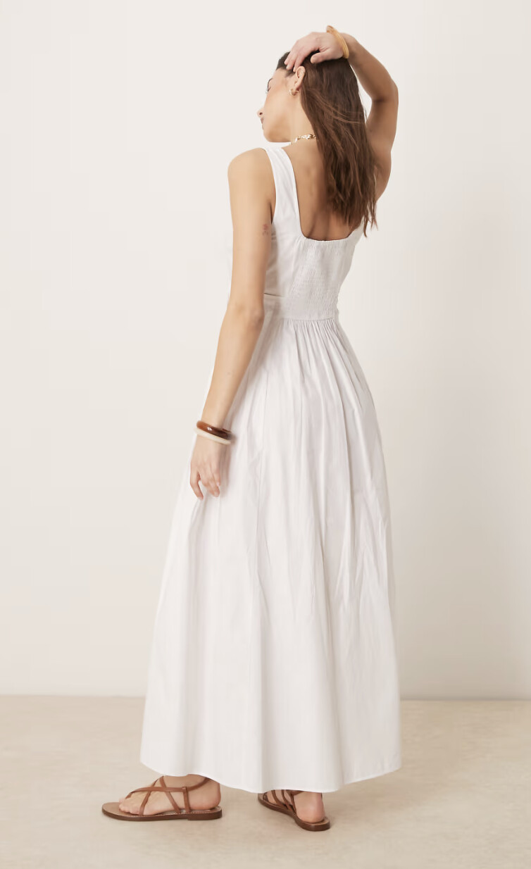 ASOS購物平台推出的白色洋裝,以中長版型的設計營造夏季愜意的風格,腰際有皺摺的設計細節可以修飾身形,也難怪甫推出後就大獲好評。