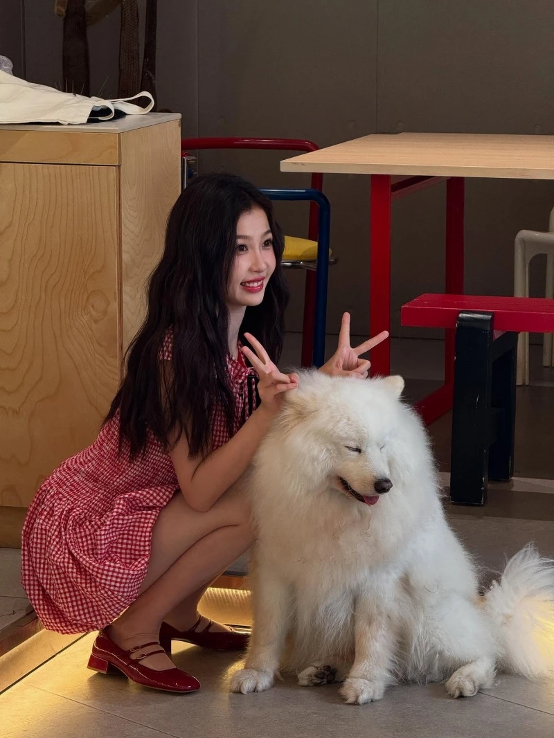 小櫻花一身紅藍色格紋連身吊帶裙搭配白色合身上衣,整體造型散發青春學院感,繽紛的格紋配色活潑亮眼,與純白內搭形成清新對比,簡約中帶有層次,整體風格減齡又有親和力。