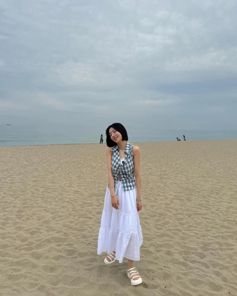 藍色格紋馬甲背心搭上白色蛋糕裙整體更有層次感!輕盈又帶點法式浪漫的度假氛圍,飄逸的裙擺更加凸顯出隨性的步伐,整體色彩具有夏氣息,是兼具層次感與明亮色彩的夏日造。