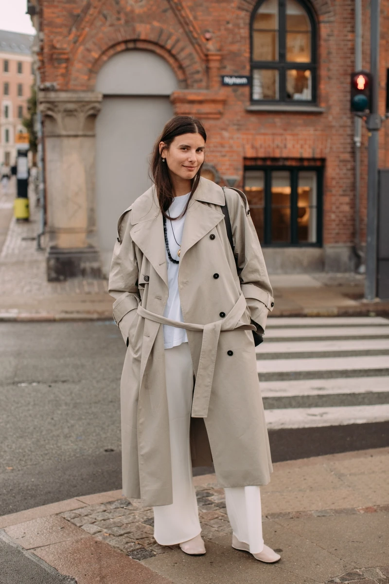 適合季節轉換時穿著的高級感穿搭,風衣加上白色寬褲,色調清新又不沉重,微涼天氣可內搭簡單T恤或細肩背心,營造層次感與慵懶氣息。