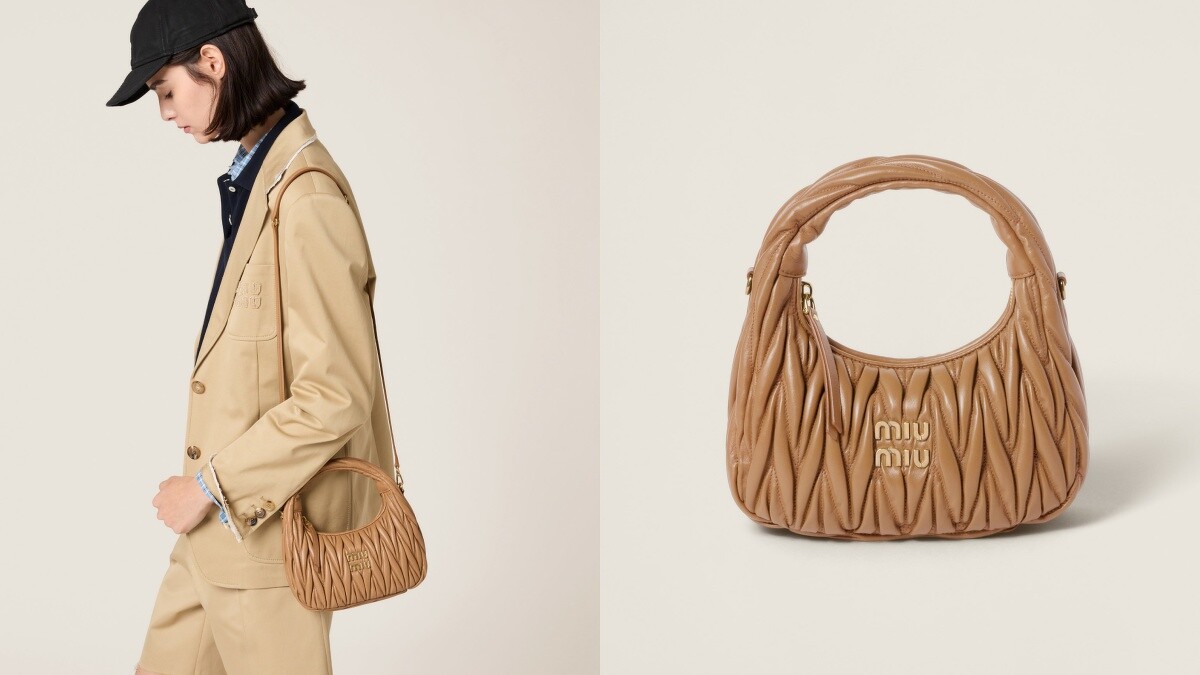 近年人氣暴漲的Miu Miu也有推出半月包款,包身以經典的Matelassé皺褶納帕皮革打造,小巧的半月包款不僅可以手提,還可以搭配肩背帶使用,包身上的品牌字母金屬Logo讓甜美不失精緻感,共推出高達11個色系可以選擇。