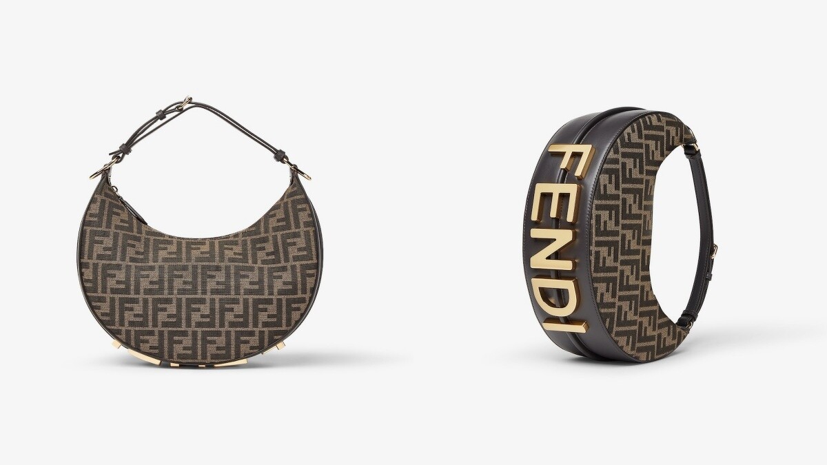 Fendigraphy hobo包款,包身是標誌性的FF老花結合硬挺的半月弧形設計,最特別的是在包包底座搭配的是金色飾面金屬FENDI字樣,整個包款充滿造型感,透過可調式手柄,可以變換成手提或可肩背。