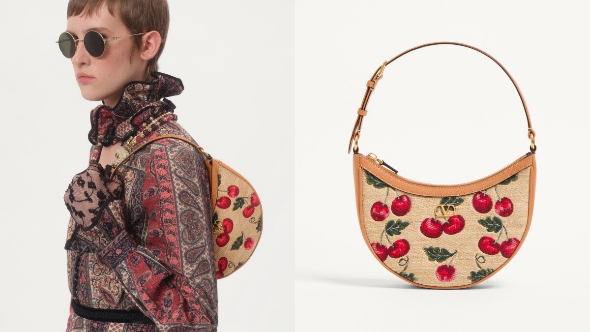 換上全新風格的Valentino VLogo半月包,包身是草編材質結合紅櫻桃刺繡圖樣,充滿度假氛圍,搭配上皮革提把與金屬Logo細節增添精緻感,也很適合為秋冬穿搭點綴活力。