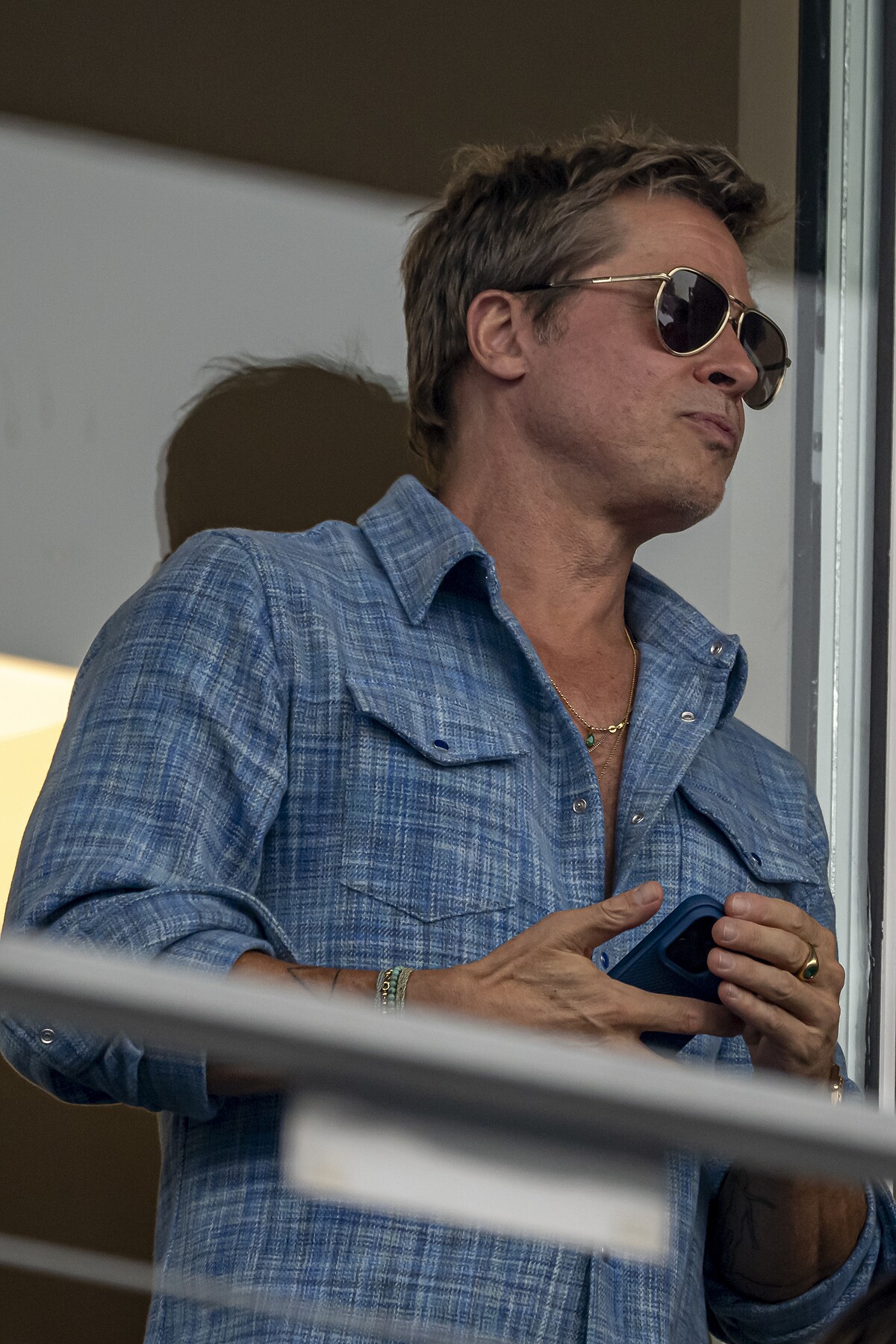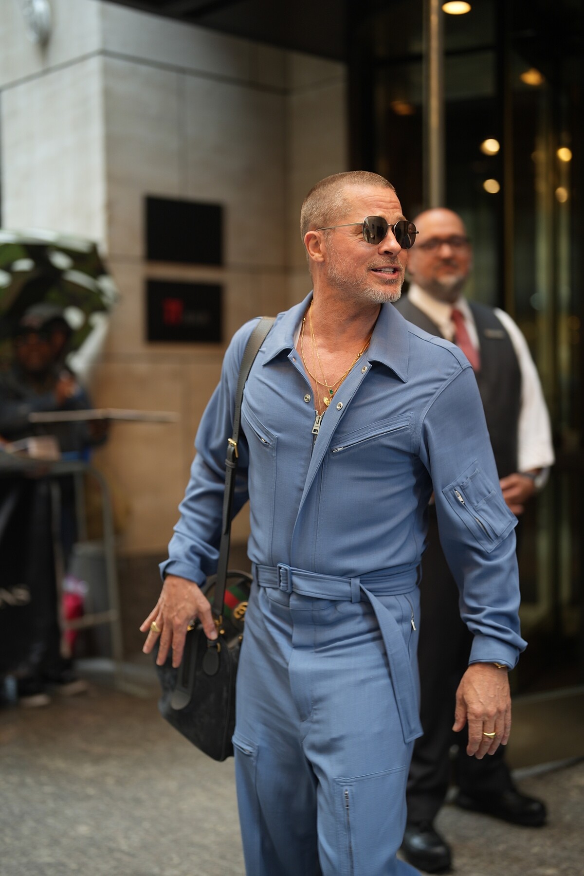 宣傳電影《F1》期間,小布被拍到穿著午夜藍大翻領拉鍊上衣,搭配藍色西裝褲及藍色麂皮樂福鞋步出飯店。上衣類似水手領的翻領設計,比一般襯衫或Polo衫的領子更多了點年輕不羈氣息,跟小布平頭造型的霸氣熟男味十分相襯,也讓下半身的長褲加樂福鞋不顯得過於中規中矩。
