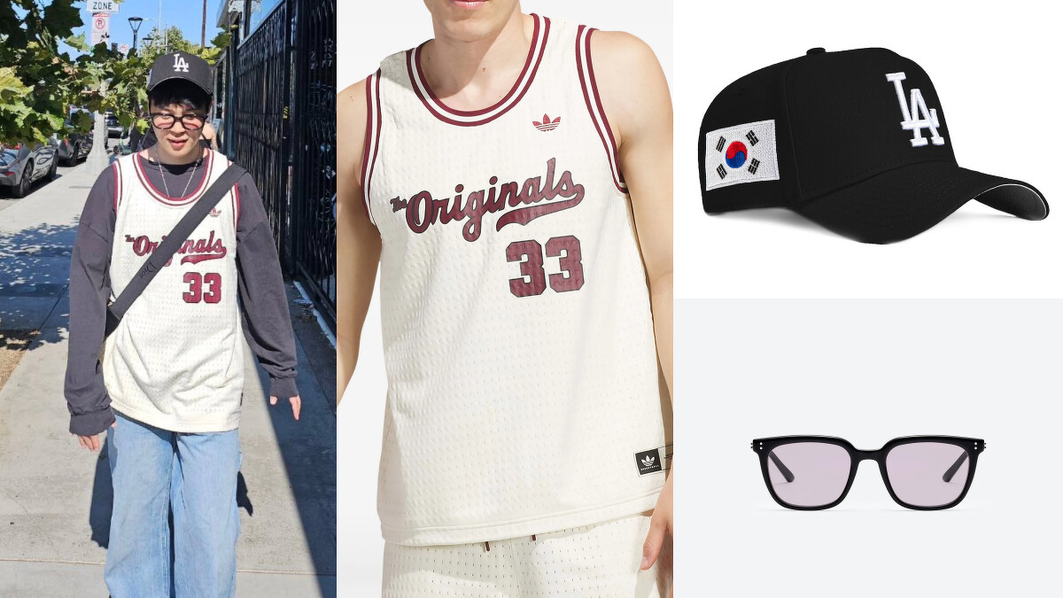 Jimin的造型以這件 Adidas Mesh sleeveless jersey 為主打,採用中性剪裁打造簡約俐落的運動輪廓,內搭長袖上衣增添層次感,使整體視覺更豐富,輕盈透氣的材質兼具舒適與功能性,不僅保留經典球衣的街頭運動風格,也展現低調卻有型的日常穿搭態度。他搭配了 New Era 9forty a-frame snapback 帽款,以洛杉磯道奇球隊為主題,點綴韓國國旗細節,經典 A-Frame 結構與可調式後扣增添休閒街頭感;再搭配 Gentle Monster Days Day 01(V) 墨鏡,黑色醋酸纖維框架與紫色鏡片營造低調卻充滿個性的視覺效果,整體造型率性而富層次,完美展現 Jimin 的私服風格。