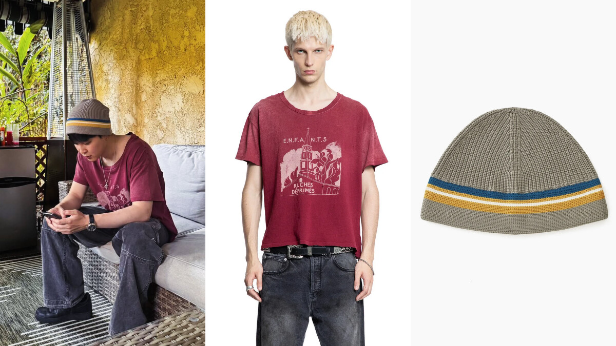 以 Enfants Riches Déprimés的 Burning Church 紅色 T 恤為核心,鮮豔色彩帶來強烈視覺焦點,同時呈現品牌標誌性的前衛與街頭態度,他搭配了一頂 Khakis Roam Knit Hat,淺灰色底搭配藍色與黃色條紋細節,為整體造型增添俐落層次與休閒感,鮮明上衣與淺色帽款的搭配,展現對色彩與造型搭配的巧妙駕馭。
