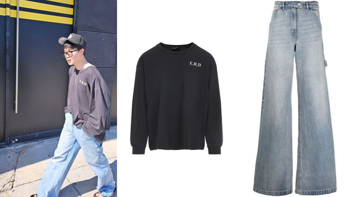 這套造型以 Enfants Riches Déprimés 的灰色長袖上衣為主,簡約色調中透露前衛感,呈現品牌標誌性的低調酷感與細緻剪裁,下身搭配 Courrèges 的 Dirty Denim Baggy Pants,寬鬆的版型與洗舊牛仔質感營造輕鬆隨性氛圍,同時增添整體造型層次。