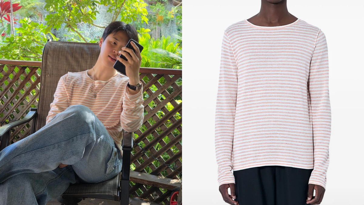Jimin這套造型以 The Row 的粉色系條紋 Knit Sweater 為核心,柔和色調營造溫暖而優雅的視覺效果,條紋設計增添細膩層次感,呈現品牌一貫的極簡奢華風格,他下身搭配淺色牛仔褲,輕盈色彩與上衣相互呼應,整體造型散發柔和溫暖的日常氛圍。簡約剪裁與柔美色彩的搭配。