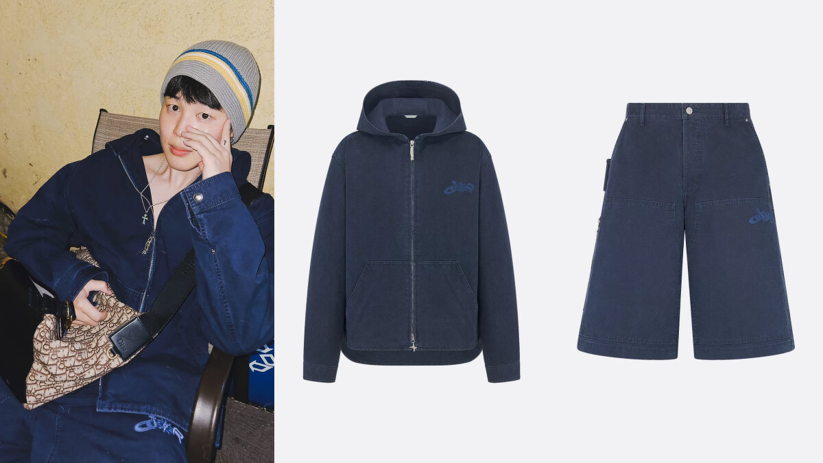 這套造型以 Dior 2026 夏季新款上衣為主打,靛藍色調低調卻富質感,領口設計配有可調節拉鏈,不僅增添造型變化,他身上背著 Dior 的 Roadie Messenger Bag,經典老花紋路與硬挺線條呼應上衣的高級質感,使整體造型呈現都市感與優雅摩登氣息。